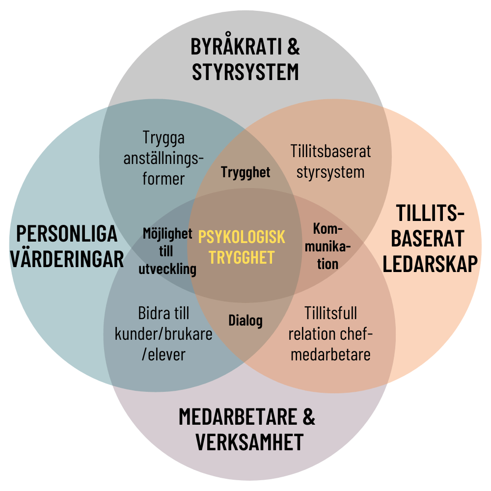 Där tre delar möts; - Trygghet är där byråkrati, tillitsbaserat ledarskap och personliga värderingar möts. En trygg chef som känner att hen har förutsättningar och rätt resurser, höga men rimliga krav och arbetsbelastning, ett tydligt mandat och god kunskap med gott stöd kommer vara trygg i sin roll som chef. Denna chef kan känna att hen bidrar till ett viktigt syfte och bidrar med något viktigt för andra människor. En trygg chef, oavsett ledarstil, är en förutsättning för att chefen ska kunna delegera ansvar och visa tillit och därmed leda tillitsfullt. En otrygg, stressad chef med orimliga krav, otydliga ramar och orimlig arbetsbelastning kommer aldrig att våga leda med tillit.